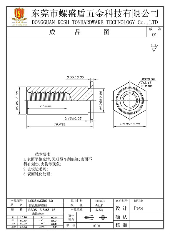 BSOS-3.5M3-16 不銹鋼壓鉚螺母柱
