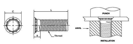 壓鉚螺絲產(chǎn)品名稱:碳鋼壓鉚螺釘不銹鋼壓鉚螺釘產(chǎn)品型號:FH FHS 產(chǎn)品材質(zhì):碳碳鍍鋅 不銹鋼 SUS304 供應(yīng)范圍:公制M3-M8 長度6mm-35mm 圓頭的壓鉚螺釘頭部下方有一個齒紋的壓花設(shè)計,采用冷墩工藝成形,生產(chǎn)速度和制造成本均比較低,安裝方式也較為快捷和簡單。使用時在基體上開一個略大于螺紋的小孔(具體尺寸要和壓鉚螺釘頭部下的齒紋壓花直徑相配合),垂直放入后用鉚壓設(shè)備在產(chǎn)品的頭部平面均勻加壓即可,壓緊后壓鉚螺釘頭部下方有傾斜角度的壓花齒紋會和基體咬合形成一個永久牢固的螺紋。壓鉚螺釘?shù)牟牧隙嗖捎闷胀ㄌ间摶虿讳P鋼SUS304生產(chǎn), 其作用是要在一個很薄的鈑金件上形成一個牢固的外螺紋。