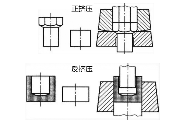 2、正擠壓:坯件在變形中,金屬沿著凹模內(nèi)壁流動,其流動方向與沖模運(yùn)動方向一致。如螺栓粗桿縮徑即為正擠壓。