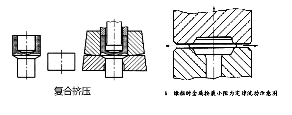 4、復(fù)合擠壓:坯件在變形中,金屬沿著凹模內(nèi)壁流動,一部分流動方向與沖模運(yùn)動方向一致,一部分流動方向與沖模運(yùn)動方向相反,即既有正擠壓又有反擠壓。如內(nèi)六角圓柱頭螺栓,在同一工位頭部沖孔、桿部縮徑,即為復(fù)合擠壓。