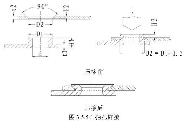 抽孔鉚接是采用其中一個零件沖孔,另一個零件沖孔翻邊,通過鉚接使之成為不可拆卸的連接體。優(yōu)點:翻邊與直孔相配合,本身具有定位功能,鉚接強度高,通過模具鉚接效率也比較高,具體方式如圖3.5.5-1所示: