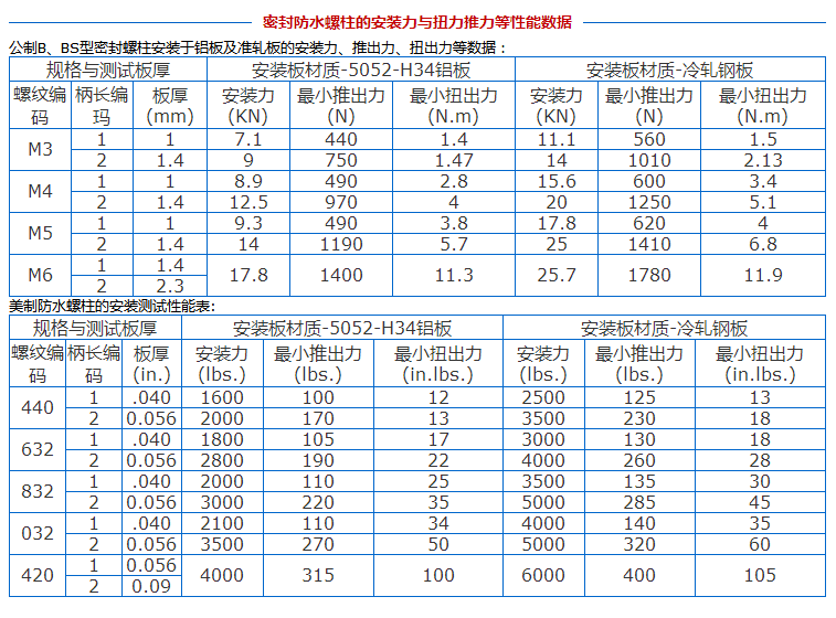 密封防水螺柱的安裝力與扭力推力數(shù)據(jù)如下圖: